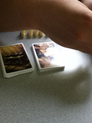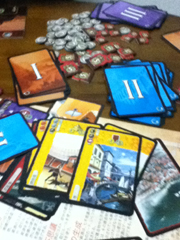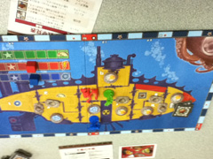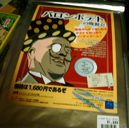 皆さん一週間いかがお過ごしでしたでしょうか。 先週は、寝取られ先生ことスシ氏のコミケ上京に合わせて 秋葉原で豪遊してきました。 面々が揃う前は中央通りをぶらぶらと歩き社会見学。 揃ってからはまず秋葉原電気街祭り(2日目)を見てこようとコトブキヤ本店に 行ってみたら、かなりショボイお祭りでガッカリ。 名だたるエロゲメーカーが出品すると聞いていたので賑わっていると 思っていたんですが、たぶん会場が違う初日がピークだったのかも。 次に、自分が楽しみにしていたイエローサブマリン秋葉原RPGショップへ。 お約束のように隣のイエサブスケールショップと間違えかつ 8階までの階段を全力で上がり無駄な準備運動までこなす。 下調べして買う物を一週間かけて決めに決めぬいた割にはお粗末な出だし だったが、決めていた品は全て手に入るという満足な結末を迎えた。 その際、買ったものをすぐさま遊ぼうと イエサブのプレイスペースを借りてみた。 平日1人200円時間制限特に無しでペットボトル程度の持ち込みも容認 しているという条件を見るに、時間を潰すか丸一日テーブルゲームで遊ぶには 最適な空間と言える。ゲームも何十種か用意してあるため持ち込まなくても かなり遊べそうであった。(土日の使用料は高めなので注意) 4時間ぐらい遊んでただろうか。 はじめの1時間で【海賊免許】のルール解読&プレイで盛り上がり、 残りをレッド★ノベンバーを救え!の解読にほとんどを費やした気がする。 どんだけブルーノ・フェイドゥッティ好きなんだ?と言われてもしかたがないほど ブルーノ氏がデザインしたゲームを堪能した。 寝取られ先生のアイポッドでプレイ風景の写真を撮ったが先生のアイポッドが ポンコツなので写真未だ届かず。届いたら掲載予定。→届いた! ■海賊免許 ![]() 三重県の大草原で育ったこの美しい腕。 ■レッド★ノベンバー ![]() 小箱にコンポーネントがこれでもかと詰め込まれていた。 念入りにマニュアルを朗読したため3人で初回クリア。 その後、横浜に移動しコミケ2日目出展前夜のG-child氏と合流。 これで最初からいたあ~るさんと合わせていつもの面子を形成。 横浜のカレー屋でナンカレーを心行くまで堪能しつつ夜に備え英気を養う。 夜はコミケ作業の横で【世界七不思議】のマニュアル解読とプレイ。 ホビージャパンの翻訳班は割と日本語が上手く構成も親切なせいか解読は楽に終わる。 プレイの感想も後に別項を設けて詳しく書きたいところではあるが、 あえて先に一つグッときたヶ所を挙げるとするなら、 "時代の終わりに必ず戦の刻が来る"というゲームの流れの部分。 ここに大きなヒストリカルとほのかな中二を感じずにはいられない。 それと、寝取られ先生が「分かりやすくて面白い」と絶賛していたところも印象深い。 しかし、先生のアイポッドがポンコツなため折角撮ったプレイ風景をお見せできない。→届きました! ■世界七不思議 ![]() 箱は結構デカイ ![]() 七不思議ボードの周りにカードをいっぱい並べるので そこそこスペースが必要。 閉めはサメ警報。 前回、「実はドミニオンよりおもしれんじゃねーの?」と面々を困惑させた問題作。 1プレイ後、寝取られ先生いわく「俺駄目だわコレ勝てないわ、勝ち見えないわ」 3プレイ目まんまと勝利してドヤ顔というよくあるボドゲプレイ風景。 だが、残念なことにその風景は先生のアイポッドがポンコツなため・・・。→サメは撮ってなかった! 朝解散、先生の三重県でのボドゲ布教が期待される。 以下、イエサブで買って来たものを家で並べた写真。 3ヶ月ぐらいあまりゲーム買ってなかったのと、 ゲームマーケットでの売り上げ金がほとんど残ってたので やや無茶をしてみた。当日はこれに世界七不思議も加わっていたので、 イエサブからしてみれば相当良い客である。 一週間前にこの日の予定が決まってからというもの、 家に居るときは同人SLG制作してるかイエサブの通販ページを舐めるように 読んでは気になったゲームの詳細を調べることの繰り返し。 絶対に手にしたいもの5品に絞り上げた中で5品とも店頭にあったのは もはや天命としか言い様が無く、購入。 中でもボックスアートを見ただけで人生初のパケ買いを果たしたのが 上の画像、【バロンポテトの晩餐会】である。 見てくれ、この、小にくたらしい男爵の顔。 ヤバイだろ? 欲しくなるだろコレ。 パッケージ自体も凄くて、レトルト食品の銀パウチになってるんだよ。 なんなんだよこれ、店員に探してもらわなかったら見つからなかったヨ。 絵画みたいなアート調も日本ヲタライクな萌え絵も構わんけど、 こういったヘンテコで妙にキャラが立ってるものがボドゲに相応しいと自分は思う。 例えばボーナンザのマメキャラとか最高だろ。あとマンマミーアのマンマミーアカードの イタリアンオヤジとか。こういうのだよ、こういうのでいいんだよ。 オサレぶる必要も萌え化する必要も無いんだって、こういうこと。ボ
