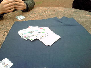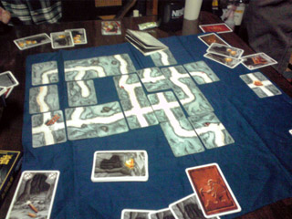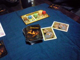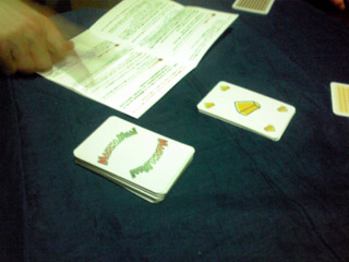 新規投入したゲームは無かったので、さらっと解説。 ■キングレオ■ ド定番のウノ派生ゲーム。 身内主催の会では毎回最初はコレ。 ルールはどう見てもウノです。 出た頃の当時を振り返れば、まさにドラクエブーム。 キャラクターどころか魔法の1つ1つモンスターの1匹1匹に 親しみがあったのは、後にも先にもこの頃のドラクエぐらい ではないでしょうか。ウノ以上に盛り上がったのは そのあたりの背景もありますが、ベースにウノを選んだ のも、容易に遊ばせられる要因として大きいところです。 全ファミにスクールパニックがあるならば、 ショーナンにキングレオあり! なんつって。てへぺろ ■マンマミーア■ 2つ目のゲームをはじめようと思ったところで天候が急激に悪化し 自宅に移動。仕切りなおして、これまた定番のマンマミーア。 が、今回マンマミーアのルールに関して大きく誤解していた事が判明。 今まで誤解していた箇所 ・焼き上げ時にレシピで使用したカードはゲームから取り除いていた。 ・焼き上げ時にレシピ外の余ったトッピングは山に戻してた。 ・トッピングなんでも15枚のカードに焼き上げ時にトッピングを足してた。 正しくゲーム回すと ・レシピに使用したトッピングもリサイクル。 ・レシピで使わなかったトッピングはそのまま次のレシピに当てる。 最後まで余ったトッピングは山札になる。 ・15枚で完成レシピには付け足しは不可。 今までラウンドが進めば進むほどトッピングカードが失われ カツカツで苦しい戦いになるゲームかと思われていたが、 どうやら別のゲームだったらしい。それでも成り立っていたから笑える。 これにより最後までのびのびとトッピングを使えるゲームになり、 最終ラウンドでの巻き返しも充分可能。 個人的にはマンマミーアの評価は1ランクがった。 やっぱりドイツゲーム大賞を取っただけはある。 "写真撮り忘れた" ■ドボン■ トランプでプレイ。写真は無いがトランプでウノをやってる図 を思い浮かべて欲しい。 ウノのルールで手札を減らして行き、 頃合を見て出されたカードに対し手札を四則演算で 合わせ当てていくというルール。 文字通り一瞬で終わるため超軽い。 トランプで出来てギャンブルにも容易に転用できそうなため、 学生が休み時間にやるには最適。ウィキペデアによるとローカルルールも 多義に渡るらしい。 トランプ派生と言えば、ナポレオンを真っ先に思い浮かべるが、 この前ナポレオンのルール丸引用のソーシャルゲームを見かけてワロタ。 ■ビブリオス■ もうすぐ日本語版が出る写本ゲーム。 写本を書く修道士というゲームのテーマからは あまりにかけ離れたメカニクスでしかも異常に面白い一作。 これも長い事ルールを勘違いしていた事が発覚。 今まで勘違いしていた点 ・配分パートで親が人数分+1枚引いて全部配分していた。 正しく回すと ・親が1枚づつ場・競り場・自分のいずれに配分するか決めていく。 人数分+1枚配分したら他のプレーヤーが場から取っていく。 配分パートの解釈が全く違うものだったので 前半のモヤモヤが一気に霧が晴れたゲームとなった。 更に、2戦目の盛り上がりは最高潮に達し、 ポイント引分け、手札の金貨の数で勝敗を決するところまでに及んだ。 本当に最高の勝負でした! 正しいルールが分った途端に自分の中で1評価上がったので、 次の機会にもビブリオスは投入したい。 ■お邪魔者■ 最後、あまり時間が無かったので5人で軽いゲームをとお邪魔者をプレイ。 これまたド定番の正体隠蔽ゲームで、インストが楽なのが良い。 今回も誰がお邪魔者なのか疑心暗鬼になりながらも鉱山を掘り続けました。 お邪魔者役は是非とも初プレイの人にやってみてほしかったが、 こればかりは運なのでどうにもならない。 というか自分もずっと金鉱掘り側だった。 ホントに2人以上いる時のお邪魔者役はマヂ面白いです。 いろいろ用意はしていたものの、ちょっとインストを含めて 新しいものをプレイする余裕が無かったのが残念。 プレイしたのは結構定番なものだったけれど、 正しいルールが判明したのはかなり大きい。 特にマンマミーアはほぼ別ゲーとなった。 次回はダンジョンレイダースやイントリーゲを投入したい。 いや、人数がいればまたキャッシュアンドガンズも捨て難い、 4時間ぐらいハードローテでレーベンヘルツもやってみたい。 そろそろ人狼系のレジスタンスもプレイしたい。 いやいやうちの協力ゲー2枚看板パンデミックとレッドノベンバー もそろそろ心行くまでやってみたい。 ゲームマーケット2012春が近く、また新規ゲームをドッサリ補充 することだろう。消化が全く追いつかん。