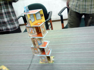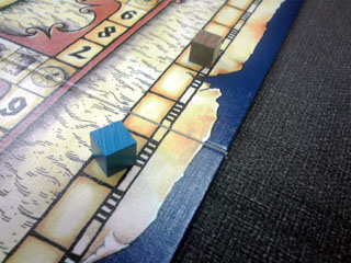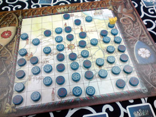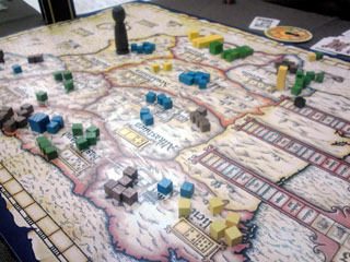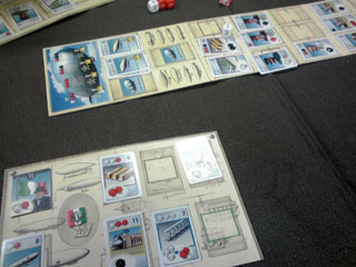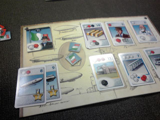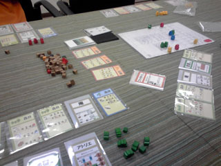 むかしむかし、はるかむかし。 仙界で2人の仙人が 夜な夜な 数字を並べ道を繋げる陣地遊びに興じておったそうな。 ある日、 関東王の段位を賭け、 勝負に及ぶと、 二仙の一人、いお仙人が勝ち、 祝賀の大遊戯宴を催すことになった。 「8の月、25の日に貴殿も来られたし」 関東王戦に大敗した えーおー仙人の元にも招待状が届いた。 えーおー仙人は雪辱を大宴で晴らさんがため、 六芸に秀でた湘南四鬼を招集し、 大宴に乗り込み、混沌の渦に沈めようと画策した。 湘南四鬼・リア充王アモンド王子に書状を送ると 「は? 彼女とキャキャムフフすっから興味ねっす(^∞^)」 と返信があり、 えーおー仙人は静かに湘南四鬼から彼を除名した。 湘南三鬼・アイドル大好きゲットマンに書状を送ると 「アイドリングあついっす!」 などと供述しており、 えーおー仙人は一応それを了承と受け取った。 湘南三鬼・UFOキャッチャー先生あ~るに書状を送ると 「暇だから行く」 という、ようやくまとめな返答をいただき、 えーおー仙人は安堵した。 大宴当日。 人界に降り立ち、 約束の地・調布を目指した。 その途上、ゲットマンより電信 「インド人を右に」 湘南三鬼暗号コード135に該当する 「今日やっぱ無理」の意だった。 唐突な戦力ダウンを強いるが、 そもそも千葉県民のゲットマンを 湘南三鬼にカウントすんのおかしくね? という身も蓋もない話で、 四人いた鬼も今や二人に事業仕分けされる。 世知辛い世の中を風刺した一件であった。 いいかげんゲーム会本編に話を進めたいと思う。 会場にて、人数が揃うまでHABAを嗜もうぜ ということで、ショーナンさんがなんとなく持参した キャプテン・リノをプレイ。 インスト2分で超簡単、5人まで遊べるという 高いパーティーゲームスペックを誇るリノではあるが、 意外と1対1の真剣勝負も熱い。 あと、個人的に好きなポイントは HABAがどこまで本気なのか分からない スペック表の「対応年齢5-99」 99がカンストなのか、はたまたあるいは・・・ なんとなく朝方に気が向いたので持っていった一品ですが、 結構回ってました。なんかもうすげえ遊んでもらっちゃって ありがとうございます。買う決断を下してよかった。 集結し、朝礼後、 最初はカップルのように2人用ゲームでキャキャムフフしようぜ。 ということで、「ローゼンケーニッヒ」 キャキャムフフと序盤にどえらい詰まり手をくらいつつ流れを把握。 コレは面白い! カードゲームより盤ゲーが好きな私にはマスト。 一見キツキツのアブストラクトっぽい物に見えるが、 その実たるや、超単純で超軽い。 予想以上にサクサクしたゲーム展開で楽しい。 かといって考えどころは多分にあり、 カードによる配置位置移動は目を見張るようなアイディアだった。 時間が許すならば、もう4~5回ローテも辞さなかっただろう。 うちにも1ケーニッヒ置きたいですね。 一家に1ケーニッヒ時代や ケーニッヒ系男子流行がきますね。 全星系28億3000人と58匹のダイスファンが認めた 傑作ダイスゲーム「ギガンテン」 邦題「天空の巨人」 「ボードゲームは使うダイスの数で面白さが決まる」 と言ってはばからないショーナンさん。 もうクォーリアーズでも買ってろよおまえという 周囲の視線もなんのその。 「右上の白衣の老紳士は医者です」 と言う、どうながねこ族関係者・ザキ氏の発言が物議を催す。 「いや、技師だろ」 「VP付きはノーベル賞取った博士だろ」 「しかしだね、飛行機械にドクターは付きものでござんしょ」 「それより、このマーカーはルアーじゃね?」 ドイツの科学力は世界一。 やたらにプロイセンがチャレンジに勝ち圧勝の図。 パスタを焼き過ぎたショーナンさんの イタリア飛行雑技団はわずか5点。 ダイス愛振るわず。 ギガンテン、傑作です。 今回のハイライト「エルグランデ」 ついに回る。 スペインの覇権を賭けて、 集結した軍勢は 北の地に覇を唱えるイリクンデ・タロア先生ことむぎん氏(青) 北東の最果てを根城とするUFOキャッチャー大好きあ~る氏(茶) 南部左側を縄張りとするイリクンデ・みんなの工作眼鏡紳士クムラ氏(黄) 南部隣の右側がこの私、ショーナン(緑)。 序盤戦、 動員に力を注ぎ、中央を軸に上手く兵力を散らすショーナン軍。 臨時決算などを駆使して手早く得点を入れていくクムラ軍。 最果てから中央に着々と兵団を送り込むあ~る軍。 派手に動かず、着実に仕込みに入るむぎん軍が後に続く。 中盤戦、 点数の上で爆走していたクムラ軍が ショーナン軍の首都グラナダを攻略するため軍勢を派遣。 グラナダ大炎上。 業を煮やしたショーナン軍、塔の中の精鋭を グラナダ守兵として増員。 世に言うグラナダ会戦のはじまりである。 一方、アクションの効果により中央の地の地価は激変。 全軍が睨みを利かし、小競り合いを展開していた 盛り上がり場であったが、地価下落により 二勢力が撤退。トレンドはその隣接地へと移った。 北部地域ではあ~る軍とむぎん軍がしなやかな 戦い