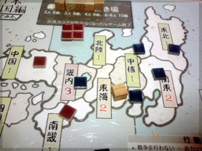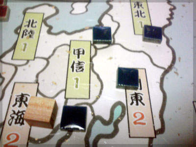 後方より甲信を攻め、全てのタイルを置ききって勝利。