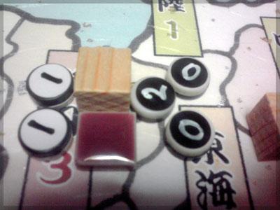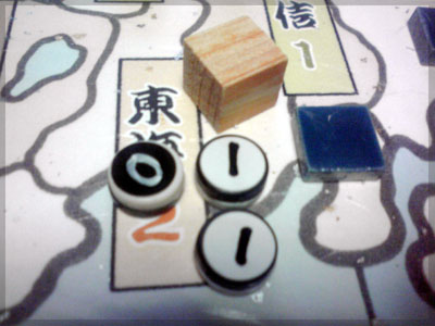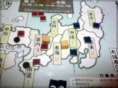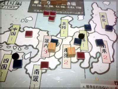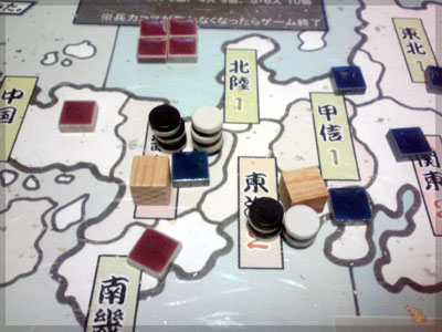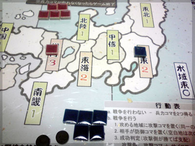 戦争する場合は5つ黒コマを使い攻める先を決める。 5つのうち2つはブラフ用のダミー。
