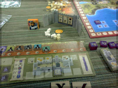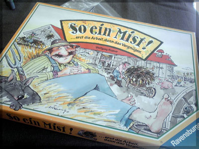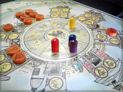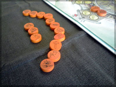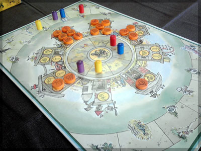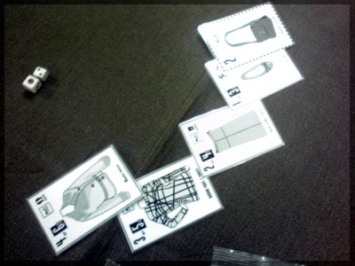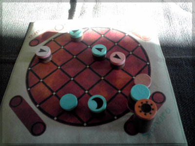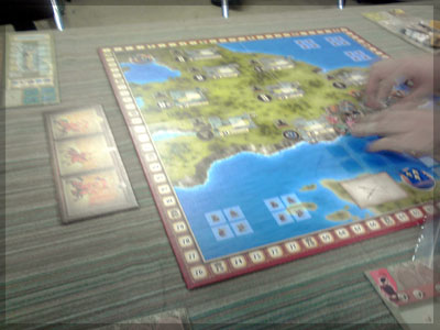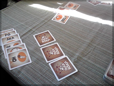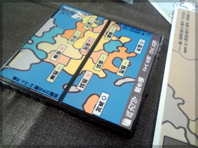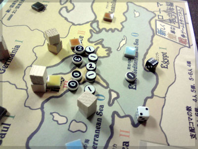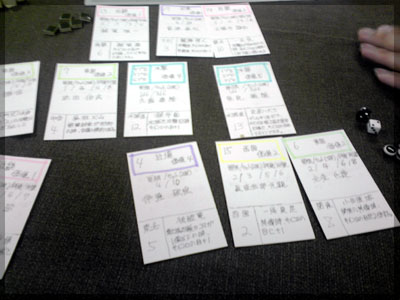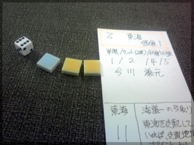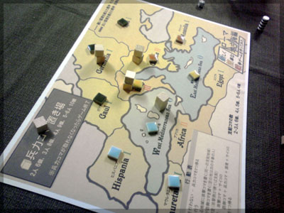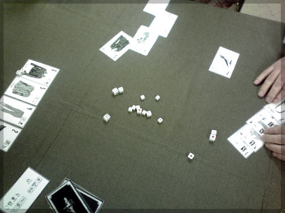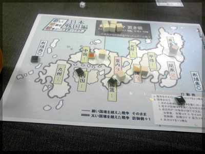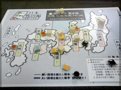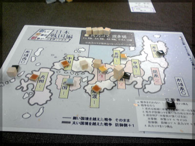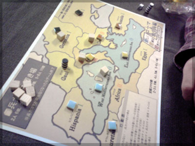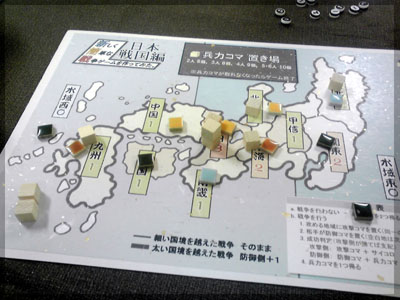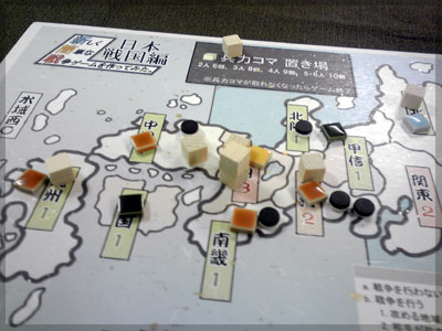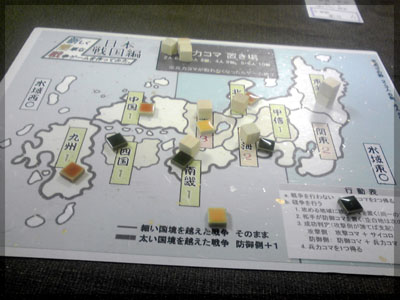 ますますボド充のショーナンです。 久々のイリパに参加してきました。 待ち合わせの調布駅で最初に遭遇したのは 相変わらずのモンハンキチガエのあ~るさん。 俺らもいい歳だし、高校生みたいな電気ゲームやってねえで 嫁みつけて身を固めようぜ、と挨拶一番あ~るさんが 集中してる3DSをさっとつまみあげ「う~らうらうらうら~っ!!」 と揺らす嫌がらせをして、相当嫌がられる。 そんなことしてるうちに面々も集まってきて、 初参加の方がいたので話を伺ってみると、 なんとっ あのっ 新簡戦の作者・エヌさんじゃないですかっ!! そんなびっくり展開にはじまる 第6回。 ■オウガボウガ なんとなく人数が対応してたので全体ゲーム的な開幕ゲームがコレに。 原始人になって言葉を交し合う究極のコミニュケーションゲーム・オウガボウガ。 現在界隈で話題になってる オーガ ってやつですね。ちがうね。 マニュアル読んだだけでよくわかるバカゲーで、 実際やってみても期待通りのバカゲーでした。 ルールは、 出したカードに書いてある言葉を実際に発声していくだけ。 次手番は指定制で、どんどんカードが積まれて行き、 積まれた分全部を記憶して全て正確に発声していかなくてはならない。 ポイントはマイナス制で、ミスしてしまった人が積まれたカードを 引き取り、マイナス点となる。 これらの発声は原始人チックに カー! ナー! ビガー! アタルル!! といった感じなので、端から見るととんでもないことになってて愉快。 なにげに逆転要素も秀逸で、ラスト近くまで記憶力によっては どうひっくり返るか分からない仕掛けもあるんですが、 今回は8人でプレイしたため、覚える量がそれどころじゃなかった。 たぶん4人ぐらいだと手札全消しのマイナス点帳消しも多々出るかな? これはなかなかのバカゲーでした。 オウガボウガ教を広めたい ■堆肥片付け いおさんがふうかさんコレクションから譲っていただいた一品。 表紙の紳士が薫風さん(シゲさんの方)のアイコンに似てるんですけど従兄弟ですか? という冗談はさておき、このゲームはクラマー作。 「これクラマーなんです」 「ぼくが好きなクラマーじゃなくて?」(ランカスターの箱に視線を移しつつ) 「みんなが好きな方のクラマーです」 と、少しクラマー話に花咲きつつスタート。 4人でプレイ。 このゲームは、 ダイスで円状のマスを移動し、止まった場所で 仕事タイルを指定の絵図に卸し、もし満席だったら全て受け取る、を繰り返す。 自分の手番開始時に何も仕事タイルを持ってなければ勝利点1ゲット。 10点取ったら勝ち。 序盤はゼツボー的なタスク地獄で トップと5点差ぐらい付けられましたが、 後半キングメイカー叩きがはじまり、見事妨害をかいくぐって 逆転勝利しました。 タスクの押し付け合いをIT業界に例えてプレイすると 「また、営業が無茶な仕事量を・・・」 「これ以上叩くと中央線を止めてやんよ・・・」 といった感じに大変業が深くなります!! オススメ!! ■試作アブストラクト 年末はスキー場のゲレンデで女の子のハートをチェックメイトする予定の イケメン・くむら先生の渾身の試作。 王・騎士・平民のコマがあり、騎士が一方的に平民を食い、 平民は一方的に王を食い、同種は干渉できない。 そして、外郭の塔が毎手番移動し、陰になるところと陽になるところで コマの移動力が変わる。 聞いた感じだとなかなか奇抜。特に塔。 1回目はその通常のルールでプレイ。 そこそこの時間動かし合って、しっかり詰んだ。 アブストラクトになってる感じはする。 2回目は食うコマと食われるコマが隣接したら食われる方即死ルールでプレイ。 こっちの方が怖いかな。一手が重い。 好み的にこっちだけれど、重なって取るゲームに慣れてると 通常のが親しみがあるかもしれない。どうだろう。 収束性がうんぬん言うてたから、 より圧迫する方法をあれから考えてみた。 死んだコマが裏返って相手の騎士になるとかどうだろう。 それはやり過ぎかさすがに 完成版に期待!! ■オキヤ 最近ガンガン回してるこのゲームをイリパでも出してみたところ、 なかなかウケは良し。この手軽さはいいね。 今後も持ち歩きたい。 ここからエヌさん直々のインストで新簡戦を4人マルチプレイ。 写真は、もしかしたら新簡戦の拡張になるかもしれない試作。 ミニマップでマグネット盤にもなったポータブル版。 次回のゲムマに出るかもしれない? ■新簡戦 ローマ地中海編 戦国はおそらく多くの人がやっているだろうということで、ローママップ。 上の写真の配置がそれぞれ 青:エヌ 緑:ライト 橙:くむら 黄:ショーナン 序盤は順当に周辺諸国を切り従えて行き、 最終的にストック兵力コマのタイムリミットが近づき、 イタリアを取るかギリシアを取るかの大決戦となる。 最終決戦でイタリア陥落の図。 ローママップもなかなか乙なものでした。 次は、試作の新要素である大名カードを使用しての 新簡戦・日本戦国マップ編をプレイ。 青;エヌ