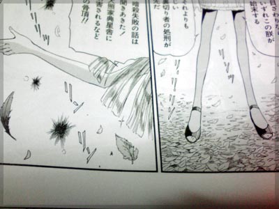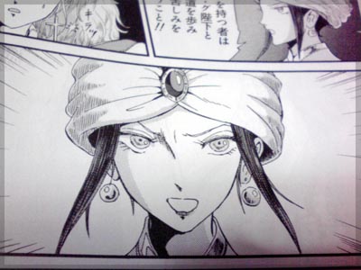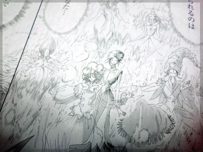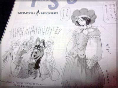 今回はアクト3 ダイ・グの花嫁が完結。 元老院の陰謀が本格的に動き出すところまでやると思いきや、 一端区切りを付けてフィルモア関連は終りのようです。 まず扉絵。 歴代詩女らしき方々が描かれています。 大きく描かれた トホホな詩女ことネオチの詩女 が 唐突の新規詩女?? 詩女たちの会話をよぉく見ると、なんとなく正体が見えてきます。 「ボルサが一番苦手なんだから」 というところからすると、それより後の詩女で かつボルサに関わりが深いフンフトの可能性が高い。 決定打は頭の丸い飾りのマークが、本編のフンフトの背中のマークと メールのマークと一致している点です。あとは靴の種類が近い。 たぶんフンフトの詩女登板当時の姿であってると思う。 (デザインズ4で発表されて全然別人でした)