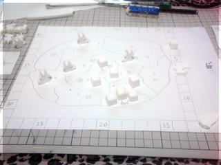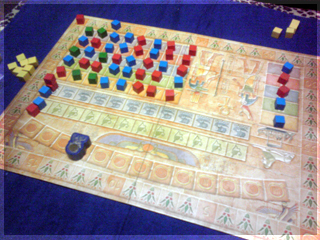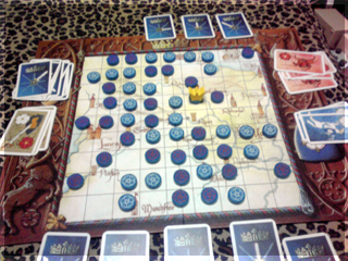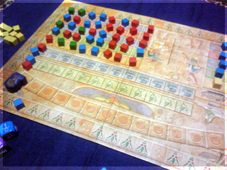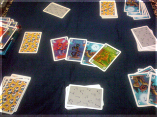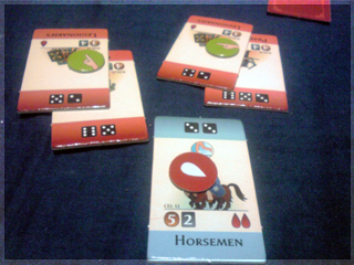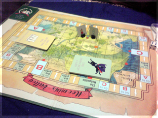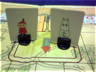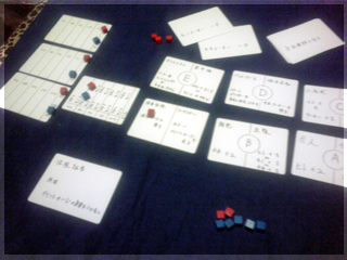となると、やはりボドゲ宅会という流れになった土曜日。 さて、今回プレイされたボドゲ群は。 ■酔いどれ猫ブルース 先鋒ライナークニッツィアの小箱。 パケ絵から既にオモシロな雰囲気を放っている。 擬人化動物系はずるい!! 内容は競り。 中央に並べられたカードを手札で競って、 集めたカードの中から同数字4枚集めたら それと数字分の得点カードと交換できる。 競られるカードか得点カードが尽きたら終了。 簡単な流れはこんな感じだ。 4回ほどプレイしてみた。 1~2回目は、なんで裏面でカード出して競るのか? ブラフかけていいんじゃね? という疑問がありモヤっとしたプレイ感。 3~4回やってみると、2種類の入札方法の兼ね合いで確かに意味があることが分かる。 バンバン落札してバンバン得点化するゲームでもなく、 手札を溜め込んで購買力を付けつつ、タイミングを見計らって身銭を切るゲーム。 どこまで得点化を我慢するか、ちょっとチキンレースっぽい。 最後までモヤっとしたが、たぶん適正3人。 はじめにカードを裏に出してベットするところに変な期待をし過ぎたのがイカンかった。 数学的に作られた地味ながらよくできた競りゲームなのは間違いない。 ■試作戦争ゲーム 2人用に特化した同時プロット式・戦力マネジメントゲーム。 とりあえず無事回った気がする。 後半資金が駄々余りだったり得点天井がやや高い感じだったので 細かい修正を入れて今週に第二試作作成予定。 ■ヒト・モノ・カネ(仮) りっちゃんの試作。ビジネスを題材としたワーカープレイスメント。 テーマとの兼ね合いがよく感覚的に要素の相互関係が分かりやすい。 1ラウンドごとに起こるアクシデントも面白く、その対応策の2つのアクションも これまたよく機能していた。 これはほぼ完成に達してる。 秋リリース予定とのこと ■ラーダイス 試作をひととおり回し、どよめくクニッツィア会を再開。 氏のダイスゲームの中でも下から数えて傑作と名高いラーダイス!! 二人でやると、2時代目序盤でナイルとファラオの競争は円熟し、 3時代目突入前にはモニュメントが埋まり、 3時代目でやることが太陽4つで災害を出すゲームになってしまう。 ファラオとナイルもリセットでいいんじゃね?とか思うんだけど、 3人だとまた違ってくるのかなー。 ■ムーミンボードゲーム ニョロニョフェスタ アマゾンで驚きの価格!!で御馴染みのムーミンボードゲーム。 いよいよ対人戦実現。 ルールはすごろくのようにダイス目でマス目を進み、 ムーミン谷に侵入し、ニョロニョロと自コマを上手く操作して ニョロニョロを捕縛。その後谷の出口にある換金所で ニョロニョロをカードに換えて得点カード化、得点カードが尽きたら スタート地点にすごろくの要領で戻って、早く戻った方は 得点になるディナーへありつけ、全員戻ったらゲーム終了。 ミィVSムーミン 特にキャラ性能差とかは無い。 結果、飛行鬼のカードトレード強制イベントが効き、 -5を受け取ったミィ大敗。 引いた得点カードの中にもマイナスが多く涙目状態。 かなりラックに寄ったゲームだ。 優勝はムーミン。 最終レースも制しディナーカードにもありつけた。 やってみた感じだと、大勢でワイワイやる系。 ニョロニョロの動かし方や、いくつニョロニョロを持ち帰るかの 博打要素もあるので、ところどころダイス目で盛り上がる 内容なのは間違いない。2人だと黙々と半周→谷突入を繰り返すゲームに なってしまいがちなので、あまりオススメできない。 4人ぐらいでやりたいところだ。 ■ポケットバトルズ ケルトvsローマ いくつかのシリーズがホビージャパンより翻訳版がリリースされている ポケットバトルズシリーズ。 おおまかなルールは、ゲーム開始時にコスト値を決め、 タイルを購入し部隊を編成。 総コスト値の1/10の命令トークンを持ち開始。 ゲームはラウンドとターンで進行し、 ラウンド中に交互に1移動と命令トークンを使って部隊に攻撃などの命令を与える ターンを回す。互いに命令トークンが全て使用済みになったらラウンド終了し 命令トークンを復帰させて次のラウンド。 勝利条件は総コストの半数のコスト分の 敵ユニット撃破。 とにかく戦力を削りあうことを目指すため、初っ端から部隊をウォーゾーンへ送り込みまくり。 60コスト戦でのプレイだったが、だいたい2ラウンドぐらいで決着がついた。 二部隊を引き受けた騎兵部隊の勇姿。 はじまってしまうと、あれよあれよとユニットが激しく散り、あっという間に終わる。 もちろんダイス運もあるにはあるが、1手1手で大きくゲームが動くので、 小コストではかなり大味になる。 一番時間を要するのはむしろコスト値をやりくりする編成。 ここが一番楽しいところなので、そこを楽しめるかどうかで評価が分かれる。 個人的には結構気にいってる。 ■レーベンヘルツ 新版 外も暗くなってきたしそろそろ大箱やるかーってことで ひさびさにレーベンヘルツ。 カタンのトイパーらし