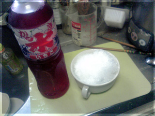 1タッパーでだいたいこれぐらいの量が削れる、そしていちごシロップ