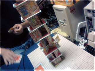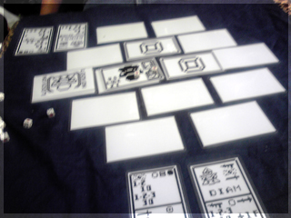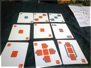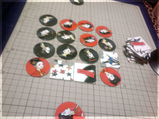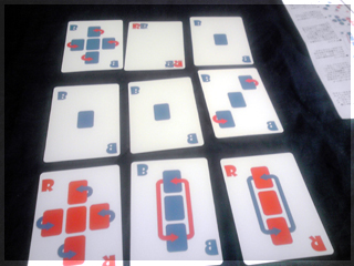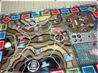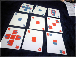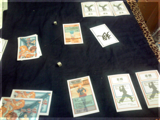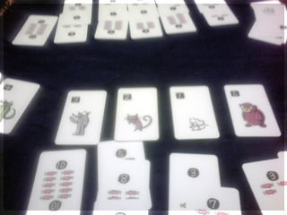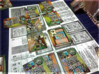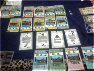 エヌ氏と2人で突発宅会しました! 朝から飲むぞー食うぞー、という勢いで、 ビールとソーセージ盛り塩鍋。 まずはかんぱーい。 キリンの濃い味をはじめて飲みました。 麦の味がかなり濃く、名前通り!! 濃い味!! 朝から飲むアルコールは五臓六腑にしみわたるぅ~ ■ウサギの都市計画 鍋を煮ている間に、ちょうど前日にロールアウトされたウサギの都市計画を テストプレイ。 内容的には問題なく回ったが、コンポーネントのある重要な問題 が露呈。 これは早急に修正予定。 という訳で都市計画は冬ゲムマで出します! ちょうどテストプレイ終えた頃に煮上がってたソーセージ鍋を食す。 うめえうめえ、ビールとソーセージのステキな出会いやでしかし。 ちなみに野菜具はキャベツともやしのみ。 ■砂時計を使った計算ゲーム(仮) 次はエヌ氏のテストプレイ。カードをめくり数字を足して行き、下一桁が 自分の点になる計算ゲーム。 特に場に置かれる数字は全体に加算される というルールがいい具合に計算を忙しくしさせてる。まさに計算ゲー。 来年以降にリリース予定だそうです。 ■RED BLUE ここからゲムマの購入品やってみようってことで、 じゃがいも騒動さんのゲーム「RED BLUE」 わずか9枚で展開されるアブストラクト!! 基本は天元に置かれた1枚の周りにお互いに1枚づつ置いてくだけ。 カードにはそれぞれ効果があり、置かれた瞬間に発動する。 そして最終的に自分の色列が多く完成したほうが勝ち。 プレイ感はテクニカルなオセロ、たった4枚を置くだけなのが こんなに悩ましいものになるとは・・・お見事!! 1プレイが短いのでついつい何度かローテしちゃうほどでした。 4種づつのカードで運要素一切無しだから最善手あるのかな~。 そんなことも気になるほどやった いいぞこれ! ■陰陽師の呪詛比べ メカニクスメイカーさんの2人用ゲーム。「陰陽師の呪詛比べ」 陰陽五行をテーマにした妖怪ゲー!! 自縛霊の猫とか今妖怪ブームだからな!! 基本はラウンドごとに1妖怪が現れ、それに対して手札から2枚づつ 五行のカードを出し行くだけ。 その2枚の組み合わせによって妖怪ごとに 効果が違ってくる。 効果の強さによって得点が変わるのだが、 同点の場合は妖怪の属性によって獲得者が決まるのがミソ。 何度も同点争いでこの判定で負けたー。 これまたなかなか乙な2人用ゲームでした。 ■裸神皇 幻想卓上会さんの2人用格闘ゲーム。 「裸になれば裸になるほど」 「なにそのガイナのゲーム!」 インスト冒頭で交わされたこの会話の時点で我々の世代には マストだったようだ。おもいきりマニュアルにもその辺の事書いてあった(笑) 裸・打・活殺!! 脱げ・殴れ・活きるか殺られるか! 気持ちイイぐらいに手札からカードがてる、殴ってる感はなかなかのものだ。 そして活殺での突然の大ダメ→死。 活殺フェイズで大逆転されたー、油断できねー。 いいねえ、突然爆発が起こるようなダイナミックなゲームだった。 ■どつけよ! さすれば、開かれん。 夕日の土建屋さんの作品。 1つのパッケージで2つのゲームが遊べます。今回はそのうち1つの 「どつけよ! さすれば、開かれん。」をプレイ。 攻城兵器をおっ建てつつ防衛陣地を構築、 ひたすら前線に増員を送りあって睨み合い、 頃合を見計らってドカンとぶつけるゲームです。 攻撃と防御のいずれにリソースを割くか 溜め込んだものをいつぶっ込むか、 なかなか悩ましいゲームでした。 ■ハコモノギョーセイ JCクリエイツさんの作品。これまた2人用。 ひたすら施設を建てて、経済点による勝利か施設の 固有勝利条件の達成を目指す。 アルコールが回ってきた頭にテキスト効果系はチト辛かったが、 これはかなり練られてる感じがした。 1度のプレイではカード間にどんなシナジーがあるのか把握できないので 2度3度遊ぶごとに味わい深くなるタイプ、いわばやりこみゲームだ。 相互効果がTCG系っぽい。 ■ロボダイス 一端小休止がてらロボダイス。 何度もやってだいぶ鳴れて来たから酒飲みながら やるぐらいがちょうどいい!! ■ドメモ ここから軽めの定番ゲームで遊ぶ。まずはドメモ。 相手から見えて自分からは見えない牌列の数字を推理するゲーム。 ルールが少なく初めての人でもすぐに始められる。 ゲーム内容自体も手軽で良し、ド定番のゲームなだけある。 一家に一個系 ■キャプテンリノ これまた定番。ひたすら高く積まれていく様がたのし。 ■みーときゃっち バッティングといえばこれ。 うちではハゲタカの餌食の完全上位互換。 基本は数字比べなのでインストも楽なのもいい。 ■オキヤ アートワークからして小粋な一品・オキヤ。 短時間で適度な読み合いが楽しめる乙なゲーム。 ■POINT:203 次のゲムマ出展予定の2人用・日露戦争ゲーム。 だいたい1~2度の押し引きから点数押しきりか本営破壊 で争うことが多いが、今回は好条件が重なり初の本営占領に成功。 ■バトロボ ロッカクだんご作品。2人用ロボット対戦ゲーム。 今回3~4回ぐらいやった