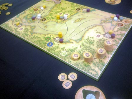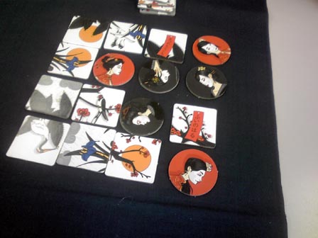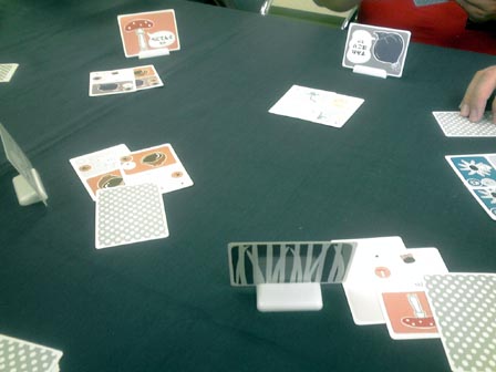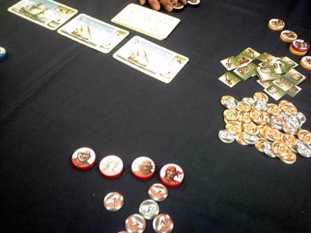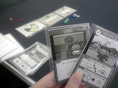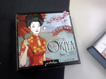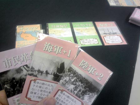 到着がかなり遅れるかなと思いきや わりと早く会場に到着。 ■ハンザ 到着早々に名作商人ゲーム・ハンザ。 ハンザ同盟地域を移動して、品物を取ったり、 自分の商館を立てたりするゲーム。 移動する船は共有で毎手番3つ補充されるコインを 使ってアクションをこなしていく。 品物を取り自分の商館がある場所で売却することによって 得点化。最終的にその数値で勝敗を決する。 自分も以前買ったので何度かソロ回しで遊んでますが、 やっぱりというかあたりまえというか、対人戦は面白い。 全ては手番が回ってきた時の状況次第なので、 人数が多いと狙ってどうこうするのが難しいですが、 めざとく品物を集めるか商館を多めに要所へ積み込んで アクションのコインを相手からもらう機会を増やすか の裁量を問われる部分は大変よくできてる。 名作でした。 ■冷戦ペンギン(仮) 拙作。来期に出す新作です。 ルールが固まったのでこれが最終調整になるかな。 上級ルールの3ライフ戦も問題なく回る感じなので採用。 あとはキャッチとか売り文句とか宣伝方法を考える段階や。 ■ウサギの黄金時代(仮) こちらも拙作、30分級の2人用対戦ゲーム。 アクションポイント制の資源変換系で、 資源は2種類・共通の状況変化が1つ、それらを勝利ポイントに 変換して6ポイント先取で勝利という内容。 想定通りにちゃんと回った。 学生が休み時間に遊び切れるを目処にしたため ゲーム会の重ゲーの合間などにも最適。かも。 現在、更なる要素の増設を検討中。 ショーナンゲーで初の試みになるかも。 今回の名物スイーツは横濱ショコラ。 ふんわりあま~い ■海賊組合 ゲムマ中古スペースで救済してきた一品、ついに対人へ。 このゲームはそれぞれ船員コマを持ち、 互いのコマに重ね合わせ、頃合を見計らって船を襲撃するゲーム。 お金を一番稼いだ人が勝利。 これだけ聞くとヒャッハーな海賊ノリゲーに聞こえるが、 事はそう容易くない。 このゲームの核心は船襲撃時の 報酬分配ルールにある。 襲撃を発令できるのは一番上にコマを乗せたリーダープレーヤーだけで、 しかもリーダーは他の面々に報酬を分けた後に余った分だけしかもらえない。 但しアイテムを優先的に1つゲットできる。だが、アイテムはゲーム終了時に 最大数もっていないとボーナス点とならない。 よってリーダーが必ずしも美味しいとは限らず、複数の自分のコマを 1ヶ所に仕込んだコマ山をいかに高報酬の船へ襲撃に向かわすか の駆け引きとなる。 しかもこの駆け引きがちょっと分かりにくいのが このゲームの敷居の高さ。分かってくると大変楽しい。 海賊テーマの豪快なゲームにみせかけて 勝つには計算高い行動が必要となってくる ある種の読み合いゲーだった。 やり込むといろいろテクがある気がする。 またやりたい。 ■オキヤ 最近常に持ち歩いてる気がする一品。 ランダム配列からはじまる絵合わせ4目並べ。 ルール超簡単・インスト楽・超短時間、 手軽と言う言葉を具現化したようなゲーム。 この独特な小箱シリーズは、もう1つのボタンゲームを やったことがある。 他にもあるみたいなので それもいずれやってみたい。 ■きのこはかせ カードスタンドにかけられた自分が知らないきのこ、 他の人がかけてる自分が知ってるきのこ、 これらをドラフトで集めて点数化して競うゲーム。 知らないきのこが2点 知ってるきのこが1点 誰のスタンドにも無いきのこは0点となり、 他人が集めているカードをみつつ 自分だけが見えないきのこを予想しながら カードを集めていくのが主な駆け引きとなる。 単純なようで難しい。 自分から見える他者のきのこを集めて着実に1点を得るのと 他者のきのこじゃない1種を決めうちして集めるかで迷う。 安全策を取ると点数が伸びづらく、 ギャンブルに出ると外れたときの失点が大きい、 ひじょーによくできてる。面白い。 ドラフト回数も状況が判断しきれるスレスレな回数で 長すぎなくダレないところが良い。 ■植民地戦争 植民地戦争さんの初期作を5人でプレイ。 やっぱり人数の幅が利くのはいい! ゲームは1ドロー1アクションを繰り返して、 1山尽きたら1ラウンド終了で毎回決算が入る。 それを3回繰り返し最終的な勝利点の合計値で勝敗を決する。 初期の国家決めでスペック差がだいぶつくものの、 マルチゲーム故のトップ叩きの上でよくよくバランスが取れてる。 勝利点に直結する植民地カードの奪い合いがゲームのキモとなる のだが、租借などで間接的に点数だけ吸い取ることができたりと、 斬新なギミックがそこかしこに付随してるのが面白い。 戦争での植民地の取り合いの部分はどことなく パニックハイスクールのプレイ感に近い。 パニハイの場合はカード枚数が兵力の推測に繋がるが、 植民地戦争の場合はカードの裏でカードの種類が分かるため、 より予測がし易くなってる。 また、兵力も数字分だけ戦力になる陸軍と、あらかじめ場に 出しておかなくてはならない海軍