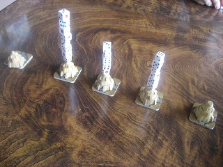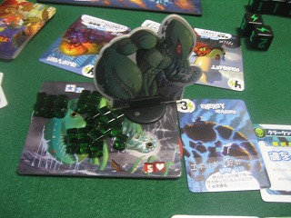 先日購入した拡張を使用、初期進化カード1枚で。それぞれの怪獣が進化を繰り返して接戦、「変身」して「エネルギー溜め」でクラーケンが逆転。