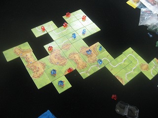 名作、タイル配置ゲーム。時間の都合もありタイルを減らして短縮プレイ。タイルを引いて配置して、ミープルを置いて、得点判定。だけで簡単に説明できるのも良いです。