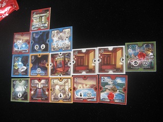 ManifestDestinyさんの2015秋の新作。ウィンチェスター・ミステリー・ハウスを作るゲーム。大浴場、プール、魔法の庭等の勝利点獲得効果に頼った屋敷を建設。序盤はよかったものの、追い上げられて2位。