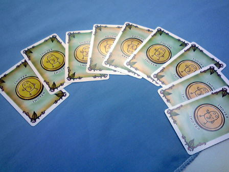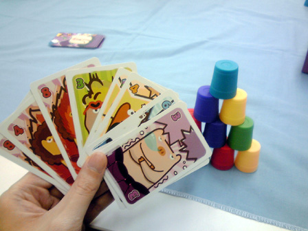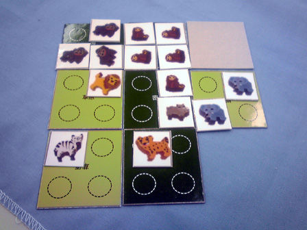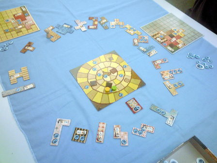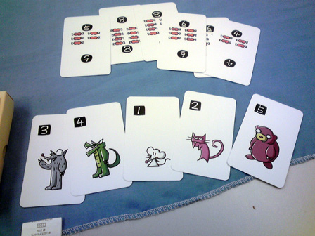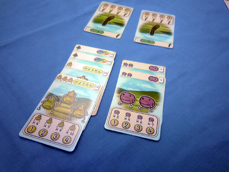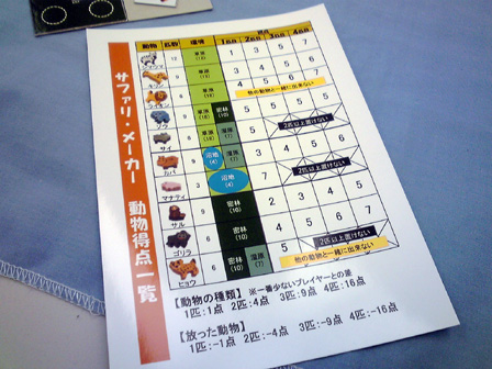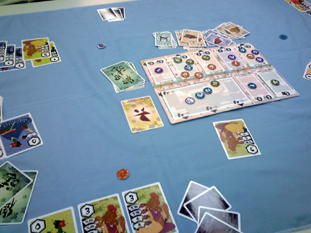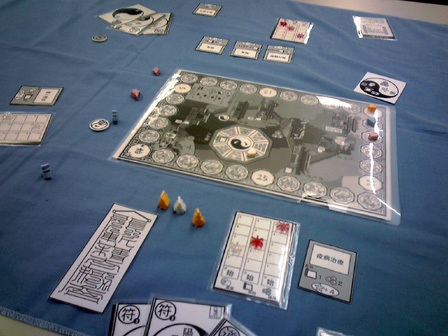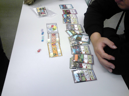 今年のゲーム会でのボドゲはこれで遊び納めか。 行って来ました多摩市民会館。 今回は、主催の植民地戦争+αをはじめ 堀場工房・彼岸堂ワークス・プビッツとこの私ショーナンロケッティアズ、 神奈川10大サークルのうち5つが揃いぶみ。史上空前のゲーム会となった。 残り5つはどことかどう史上空前だったかは想像にお任せするとして、 ゲームの様相や感想に行ってみよう。 ■ウサギの黄金時代 拙作。現場に到着した時には既にプレイ中。 なんかもう何回もプレイしてくだすってるそうです ありがてえありがてえ。 来年ロロステに委託する予定です みんな買ってね!!いきなりダイレクトマーケティング。 ■星をなくしたキャロティン ゲムマでわずかな部数出回った完全手生産ゲーム。 みんなで星を置いて、その上に透明プレートを被せ星座を作るロマンチックゲーの極北!! プレイはこのように黒マットの上で行われる。 透明プレートの大きさに収まるように、目測で星を配置していくのが 主な内容なのだが、星2つまで抜け出て良かったり、その絶妙な2つを置いた人にも 加点されたりするので、配置を巡っての駆け引きがある。 そして配置が進み、星がいくつかあぶれ進達成不可能と見る場合はパス抜けするのだが、 逃げ遅れると割りを食う。 チキンレースっぽい様相となる。 配置する星の形もこのように数種に別れている。非常にコンポーネントが凝ってる。 ゲームも老若男女楽しめそうだった。 ■御用達 資源やカードの獲得権や変換権をエリアマジョる和テーマゲーム。 ブラインドオークションなのかな? 常に手持ちのマネーパワーが一定だから、あんまし競りって感じがしないんだけど、 その手持ちのマネーパワーの配分と競合がとにかく熱く、よく盛り上がった。 4人で遊んで最後の最後まで勝敗が見えない好ゲームを展開した。 ■たねまき そういえばまだプレイしたことがない!ということでついにやりました、たねまき。 ゲムマ界隈で最も種愛に満ちたゲーム。ボーナンザフリーク必携の一作。 ここで唐突に話は脱線するんだが、 俺は始めてのゲムマ出展時に隣の中古放出ブームでボーンハンザを購入した思い出が あるほどの種フリークなんだが、それもさておき、 その同じブースでボーナンザの自作拡張が出展されてたんよ。 既存のドイツゲームの拡張を勝手に作るって、それ結構斬新だと 思ったんよね。自分の好きなゲームの可能性を更に広げるべく手を加えてキットを売る。 まさに同好の士を求める活動、すなわち同人活動 であるな、と感心したものだが、 俺そのボーナンザの拡張とウボンゴの自作問題集以外そういうの見たことないんよね。 もっとやればいいとおもう。みんなソロモンの王国の拡張とか作ればいいと思う。 さて、長い脱線からたねまきの感想に戻るとしよう。 これ、すこぶる良い。 やることは親がカードを配って子がそれを受け取るかタライ回すかなんだけど、 その親から子にわたされ提示したカードが無言の交渉になってるんよ。 「おい、これで満足しとけ」 「ほら受け取らないともう一人が肥えるぞ」 「オマエノハタケツブス」 といった具合に、無言で損得勘定を促す交渉をしているところがボナってる。種だわ、種愛。 二段階目を目安にしてマメに換金してたら、なんか勝てた。 牧歌的なアートワークでなかなかプレーヤの腹黒いところが出るゲームだった。 ■みーときゃっち 500円ゲームズ最盛期を築き上げた傑作5選の一つ、 もう4つは何かという話もさておき、久しぶりに大人数で遊びました。 カードの強弱が最高値と最低値で逆転して更に2まで巻き戻るのが面白い。 一番人気の肉場がざわつく。 どうせ誰かクマしかけてくるからラッキーネズミを狙うか、 ネズミまでは規定路線だからそこでネコだろ、 と読み合ってかーらーのー、ネズミ ネコ ネコ 狼! 狼総取り!! とかよくある訳で。なかなかカオス! 間違いなく500円ゲームズ最高傑作。 ■バケツ崩し3D 物理学の作用を取り入れたトリックテイキング。 以前はカードで積み重ねたバケツピラミッドを表現していたが、 立体物となり、わりと愉快だった内容がより一層愉快なことになった一品。 多くトリックを取るとか 押し付けるとかじゃなくて、 このバケツが二段目以降完全倒壊したら負け、というトンデモトリックテイキング。 まとめ出しがエグいのでトリックの加速が早いのでゲームテンポが良過ぎるところは 好みが別れるかも。 わりと好き。 ■武当掌門テスト版 拙作の試作。今年後半に自分の中で訪れた空前のババ抜きブーム中に生まれた ババ抜きワーカープレイスメント。ラウンドと連動するチャンスカードが現在固定なため、 毎回のゲーム展開に変化を持たすためもうちょい増やすことになった。 ゲームはやや独特な行程を踏むためマニュアルで要補足な感じ。 我ながらわりと攻めた内容になったとおもふ。 ■サファリメーカーテスト版 千夜さんの試作。前作の海の仲間達につづく陸