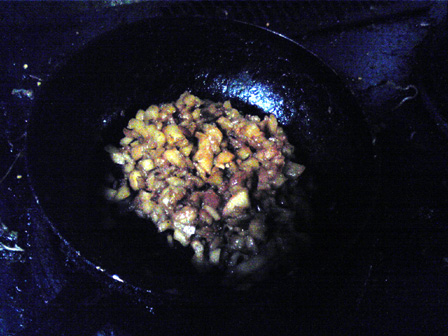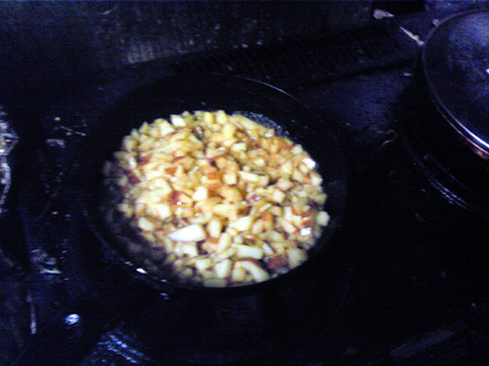 りんごを細切れにして、マーガリンと砂糖を入れて炒める。