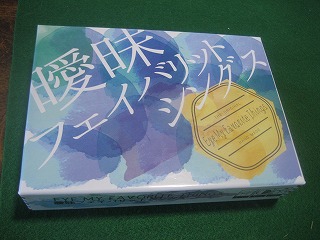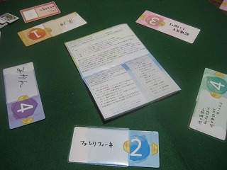 するめデイズさんの2015秋新作。それぞれの個人的ランキングの順位で勝負するトリックテイキング。1ラウンド目は「シャンパンゴールド」vs「アルハンブラ」vs「緑茶」vs「テント」vs「自分」など、2ラウンド目は「ゲンヨーサイ」vs「りんご」vs「119」vs「好きなタレントを呼んで誕生日パーティー」vs「戦うことが罪なら俺が背負ってやる」など。勝てなくてもエピソードを語れただけで満足。