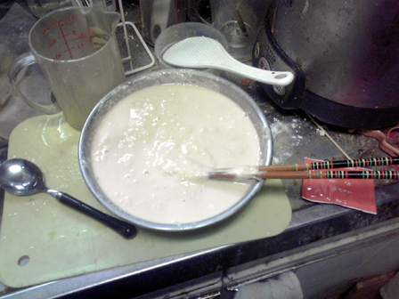 その間にナンの種をこしらえます。 材料は小麦粉・卵・砂糖・塩・マヨネーズ。