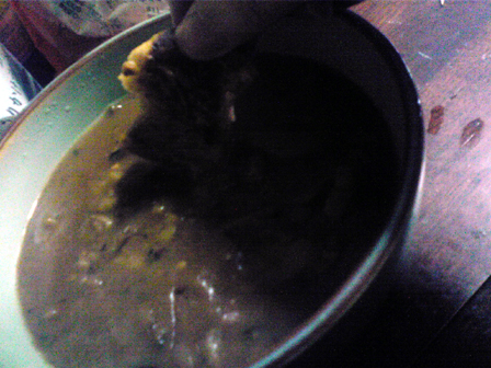 はい、まずはカレー用の水に唐辛子一本粉々にして入れて火にかけといて、