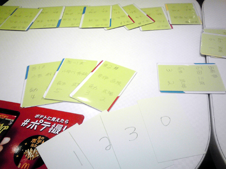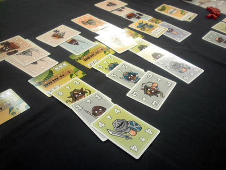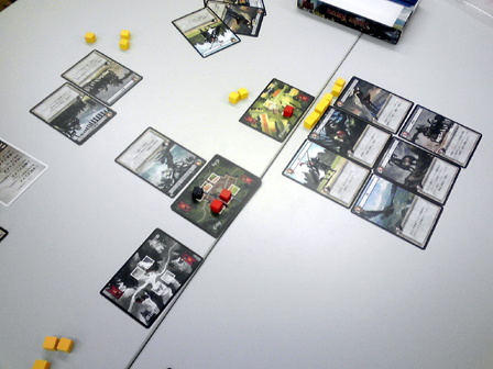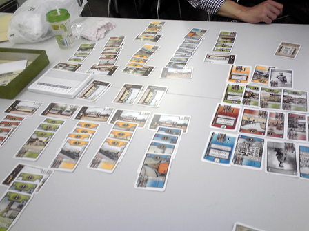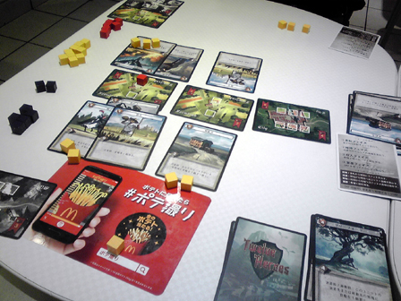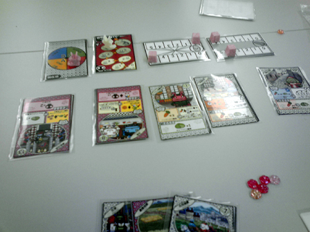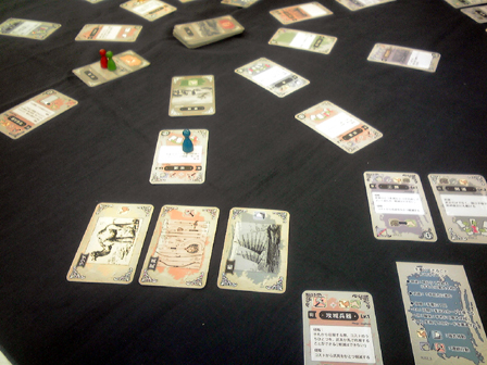 ひさびさのゲーム会参加。 ゲムマ後ということで話題の新作が多々持ち込まれてました。 その中で遊んできたものの感想をば。 ■トラムバーン ステキなアートワークで界隈がどよめいた2人用列車テーマのゲーム。 前日にルールを読み込み、サマリーまで作成して対人に挑戦。 手番中の行程がいくつかあるため、インストの上でもプレイの上でも サマリーを作っておいたのは正解だった。 共通の場と自分の場にカードが並べられていくため 場所をかなり広く使う。 ゲーム自体はこれでもかというほど拡大再生産で、 自彼の利益を推し量りつつ小決算を繰り返す。 プレイ感は軽い。 これは非常に良い2人用。 詳細な感想は別項でやりたいと思う。 ■命の砂時計 余命わずかとなった病弱美少女の生死を駆けた、2陣営の戦い。 正体隠匿すごろく。まさしくそれ ダイス振って並べられたカード道を進み、止まった場所を開いて 手札か開いたカードのいずれかを処理する。 これを繰り返すだけ。 非常にシンプルで分かりやすい。 これが陣営を示すカード。 治癒サイドと病魔サイドがあり、 双方の勝利条件を目指して駆け引きが行われる。 ゲーム時はこんなかんじにカードの道が形成されて ダイスすごろくをする。 そして7ターンという時間制限。 今回2回ほどプレイして2度制限時間切れとなり病魔サイドの勝利となった。 感覚的に病魔カミングアウトで初期から結束すれば有利かなとも思ったが、 ダイスの出目や各陣営にとって有利に動くカードが前半に配置されているか後半まで 出ないかとか、いろいろと運の要素も絡むためそうとも言い切れない。 シンプルなルールで正体隠匿を楽しめるのが良い。なかなか面白かった。 ■拙作の新作テストプレイ 今作ってる二人用協力ゲームをテスト回し。 既に何度もテストを繰り返しバージョン6となり、 難易度を高め過ぎて過度期となったため 一気に難易度低下調整。 実際やってみると今度は冗長的で簡単過ぎたため、 収束性と難易度を高める要素を追加。 たぶん仕様は固まった。 近日詳細公開! ■トゥエルブヒーローズ ゲムマ春の話題作。 領土をめぐって軍隊を派遣し、メシを食わせながら戦わせるゲーム。 ミリタリテーマに転用したくなるほど魅力的なシステムで兵站を表現してる。 今回はインストのみで対戦を見学してみた。 序盤は食料がひじょーーにカツカツであるため、 やりくりが悩まし過ぎる。 戦線を維持するための運用を見ているだけで胃が痛くなってくる。 手札運任せや小手先より明らかに計画性がものを言いそうな感じがした。 面白そうだが難しそう。明らかに人を選ぶ。 ■きのXたけ きのこ陣営たけのこ陣営に分かれて みんなでバトルラインするゲーム。 まず某駄菓子を模したパッケージが面白い。なかなかにしてキャッチーである。 何の因果か、イベントを同じくして某有名お菓子メーカーの 参戦があったことも印象深い。 アニメ「だがしかし」といい今年はお菓子ブームなのか? 今回4人でプレイ。 ルールの基本はバトルラインのように それぞれの対峙する場でカードの色と数字で役を作る。 役が確定したところで強い役を作った陣営へ点数が入る。 そして陣営はいつでも鞍替えすることができる。 プレイ感はみんなで好き勝手に置くバトルラインだが、 陣営替えをするタイミングがキモで、 この要素が非常に面白く組み込まれてる。 面白かった。 ■ブリックパーティー 設計士と建築士に分かれて、 レゴでいち早く目的の形を作り上げるペア対戦ゲーム。 ウボンゴ系と思ったか、そいつは違うぜー! 空前絶後のコミニュケーション早解きゲームだ! 設計士役は設計図を見て、 あらゆる手段を講じて建築家に組み立て方を伝える。 建築家は設計図を見ることが出来ない。 そして組み立て方には毎回ユーモラスな制限が加わる。 今回大人数でやってみたが、 良い意味でやばすぎる これは盛り上がらないわけがない。 キャプテンリノ・ウッドマンにつづく一家に一台物件かも。 詳細な感想はもう一度ぐらいやって別項でまとめたい。 ■エイジオブタタール モンゴル騎馬民族が世界に侵略する時代をテーマとした、 リソースマネージメント。 手持ちの資源を費やして移動して取るをひたすら繰り返す。 ひたすら繰り返し他者より先に良い土地を取る! 今回ゲーム会終盤からはじめたため 途中で協議終了となったが、ゲームはすこぶる好感触。 いかに効率よく動くかの駆け引きが熱い。 ここからマックで二次会。 トゥエルブヒーローズ2回目。 今度は自分がプレイ。 前半食料を蓄えこんでドラゴンを召集し猛攻撃をくわえたものの 中盤から息切れして逆に大軍勢で押し切られてしまった。 むずかしい 実にむずかしい。 どのカードにもシナジーを感じるけど上手く扱えず、 ただただ研究不足を実感する。 基本は同等の戦力をあてがっての睨み合い なので長期戦になりがち。上手く勝つには熟練度を用するゲームだ。 ドローがあるので引き運も
