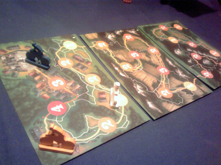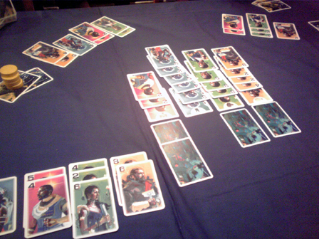 行ってきました、六本木。 年をまたいでいろいろゲームやってきましたーッ!! 以下じゃんじゃん紹介。 ■ジョリー&ロジャー 中央に置かれた船を取り合う、一見するとバトルライン的なパワーゲーム。 毎手番5枚のタイルを引いて、それを二組に分けて相手に選ばせるという ユニークな切り分けを行うところが面白い。ゲームが進むほどに切り分けが悩ましく、 伸ばす場所と損切りする場所の決断がアツイ。 ルール量もほどほどで二人で楽しめるゲームとしてなかなか良い感じだった。 ボドゲカフェとかではこういうゲームやりたいよネ。 ■スイーツスタック サツバツテトリス!!!! 相手が詰みそうなブロックを押し付ける 擬似落ち物パズルゲーム。 ブロックの回転やキャンセルをMP消費スキルするアイディアは面白く、 ラインボーナスなどの得点設定もよくできてる。 落ち物ゲーム愛に満ちた一作でした。 普段デジゲー・スマホゲーばっかりやってる女子とかといっしょに楽しめそう。 ■リカーーーリング リカーーーリング、それは宇宙。 リカーーーリング、それは法則。 リカーーーリング、それは小さき数字が勝り、 リカーーーリング、それは枚数多きものが勝る。 リカーーーリング、カードの中央に宇宙を感じろ!!! ーリカーーーリング、それは宇宙の法則。ー 傑作 ■メデイチカードゲーム ルール聞いた時点だと、「ああメディチだわ」と思うし、 得点周りはまんまメディチではあるんだよね。 ところがどっこい、メディチって競りゲームじゃないですか、 プレイ感はメディチから競りを抜いて引きゲーのチキンレース部分だけ 取り出した感じ。 そもそもそれだけでゲームとして成り立つ事自体 メディチってすげえなあと思うのがこのカードゲーム。 今回4人でやったけど結構楽しかった。 自分が集めてる品種を誰かが集めだして競合するとアツイね。 たぶん人数多いほど面白いと思う。 ついでにメデイチカードゲームいただきました もへさんありがとうございます>< ■老師敬服 以前テストプレイにも参加したので二回目のプレイ。 一番度肝を抜かれたのはパッケージをラウンド表示に使うところなんだけど、 ゲーム自体もすこぶるよくできてる。 アクションタイルの二択が悩ましく、更に1つは1ラウンド帰ってこない、 しかもこのゲームたった5ラウンドしかないから、ホント計画性ないと あっという間に終わる。 ともすれば、敬服の相乗りでわりとどーにでもなったり、 敬服されて点数が意外と伸びたり、キツキツなようで内側は柔らかい。 あらゆるゲームの相乗り要素に「敬服します」と言いたくなるので、 個人的には2016ボドゲ流行語大賞はコレ。 ■キャピタルラックス 大船でプランE氏の密輸話とセットで盛り上がった、あの、キャピタルラックス再び。 こちらはエッセン後の流通版で黄色トークンが円形だった。 さすがに1度遊んでてちょっとした勘所があったので、勝たせていただきました。 やっぱりおもしろいねコレ。部分的には斬新さはないのだけど、 こういう合わせ技でまだまだ面白いものが練成されるんだなあと、勉強になります。 ■Red7 なにげに4回目ぐらいかな。妙に縁があるゲーム。 今回初めて上級ルールでプレイしましたが、やばいね、 よりトリッキーになった。明日勝てる方法が見えない!!! 相変わらず"ぼくのつくったさいきょうの○○"という名に相応しいルールだ。 ■ダイスロードレース まず、レーザーカッターで切り抜いたであろう精巧なコマに感嘆。 持ちダイス3つ開始でダイス複数振った場合6が出るとダイス1つ永久消滅という 取り返しのつかないギャンブルルールに驚愕。 同じマスに存在すると相乗りロールできることに敬服。 我々はゴールという哲学へ向ってペダルを漕ぎ出したー 堅パンいただきました。 パンじゃねーーーよこれぇ!!!!!! 超堅いビスケットやろ!!!!! でも美味しかったです、堅いものからいものダイスキショーナン。 ■キーロンドン ゆるめの競りとゆるめのワーカープレイスとゆるめのビルドと 複雑な得点源が合わさった重量級ゲーム。 ワーカーをどう配置していくかひじょーーーーに悩ましい。 相手が立てた建物にも配置できるので、競り部分に注力し過ぎなくても いいのはよく分かった。 1プレイでいろいろわかったので再プレイしたい。 なかなか面白かった。 ■ポンジスキーム 前評判でイントリーゲの再来と聞いていたので、ちょっと期待値が高過ぎた。 ルール自体はシンプルで、借り入れた資金を返済日に返すを繰り返し 誰かの資金が溶け切るまで我慢比べをするゲーム。 根がセコイせいかついつい小額の借り入れを繰り返して先細ってしまったが、 もっとおもいきり借り入れて、インサイダーももっと微妙な値段ちらつかせればよかったかな。 なかなかユニークではあった。 ■ヴァンパイアクイーン パッケージが実はヴァンパイアクイーンではないという出オチがまずオモシロ。 なんかやったことあるなあと思ったら、ああ、ロ