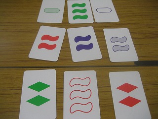 1991年のドイツゲーム。4つの要素について一致か異なる3枚セットを探す。シンプルに難しい。