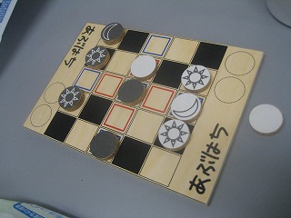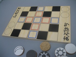 有限浪漫さんの2012年作品。マスとの色の関係で、一定のルールに従い1手番に複数の駒を動かせる三目並べ。お互い手探りで、何とか一手差で達成。