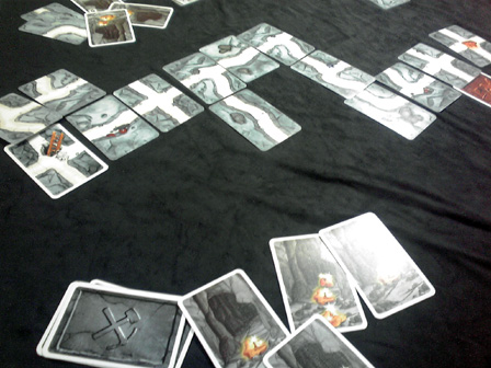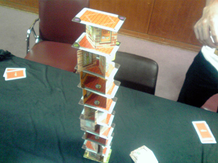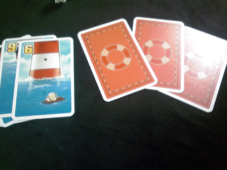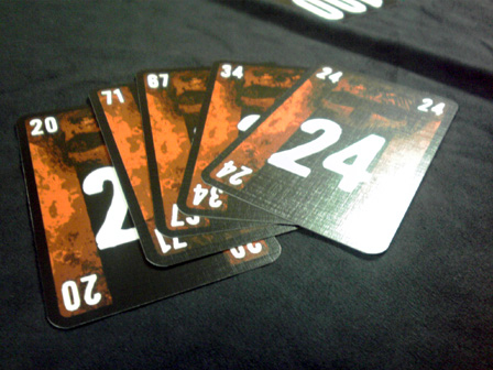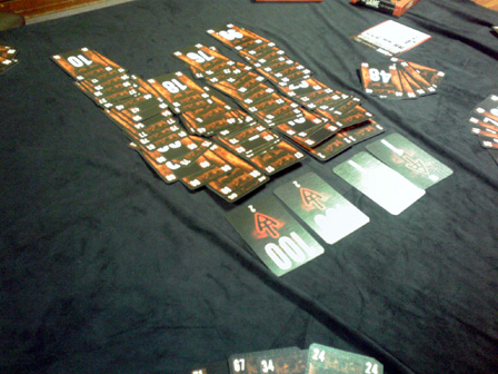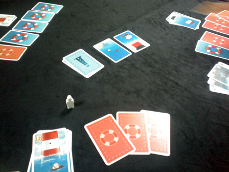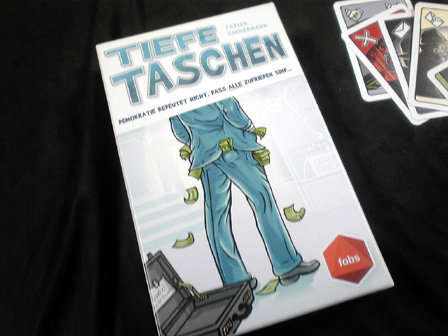 半年に1度のエクスタシー!!! やってきました大船最大のボードゲームイベント!!! 大船ボードゲーム夜会 ででーん!! 今回はコミケ初日と盆に被るということで 当初参加者が集まらないのでは!? という懸念がありましたが、 5人もの参加者が集まってくれましたー!!! 感謝雨アラレ。 いつもどおり2時間早く現地入りし、 ブックオフ大船店を視察してきました。 いやはや、どでかいですねあそこは。 ハードオフかホビーオフかってぐらい、玩具が充実してて驚きました。 ここ数年の戦隊やライダーのアイテムが多くキッズ客が 明らかに通常のブックオフより多いのが特徴的でした。 反面、ゲームソフトの揃えはまちまちだったかな、 ヤフオク出品中の張り紙が多かった。 大船に来たら、また寄ってみたいでぇす。 30分前に現地到着。 集会室でボドゲを並べて準備していると、 隣の集会室利用者でメンツ待ちしてるご老人が 室内に入ってきたーーーっ!!! 「これはなにすんの?」 というドストレートな質問に 「これボードゲームなんですよー マージャンみたいな、 大人でも楽しめる海外のゲームなんっすよー」 あれ・・・ この展開、以前にも・・・う・・・眩暈が。 よく見ると前回(半年前)に全く同じ質問をしてきたご老人じゃんかー!!! 「あんた、はじめてだね? いつも見ないし」 忘れてるーー!!! ご老人、半年前にボードゲームについて熱弁した 俺のこと、さっぱり真っ白に忘れてるーーーっ!!!! 再び海外ゲームのことや、最近流行りだしてることや、 テレビゲームとの違いなどなど散々語ったところで、 ご老人は感銘を受けて隣の集まりに帰っていった。 その後、プランE氏到着。 何からはじめか話していると・・・ 「こんにちわー はじめましてー 遊びに来ました、 ボードゲームはじめてやります~」 今回の紅一点・ゆうもんさんが来た。 なんでも初めてボドゲをやるらしく、 この大船会が初のボドゲ会参加。 ■キャプテンリノ はじめてのボドゲと言ったらHABAでしょう。 そんなワケで定番のキャプテンリノ。 プランE氏もなにげに初リノだったらしく3人で大いに盛り上がる。 キャキャムフフと遊んでいると、 あ~るさんと、これまた初参加の木葉さん到着。 そのまま2回目のリノ。 バランスゲームは目に見えて楽しさが分かりやすく、 盛り上がりやすい。 ボドゲの入り口としてはかなり優秀な一品だ!! ■ザ・ゲーム ショーナンが盛り上げたのなら、この俺もっと言わんばかりに プランE氏が協力ゲームの傑作ザ・ゲームを取り出す。 2~99の手札カードを1と100の初期カードに昇順降順にひたすら並べていくゲームだ。 全員が一致協力して手札を出し切らなくてはならない。 「へえ~ こういうのもあるんですね~」 協力ゲーム初体験にゆうもんさんがひとしきり感銘を受けていた。 ルールはシンプルながら、出し切るとなると難しい。 今回はゲームオーバー。 かなり念密に話し合って出さないとクリアは難しそう。 結構良いゲームだった。 これまた初心者でも遊べる傑作だ。 ■ブクブク 3ゲーム目はあ~るさんの持ち込みブクブク。 ルールはそこまで複雑ではないのだが、 ここ半年で3回遊んでるのに毎回ルールどんなだっけ? となる。 ゲーム自体は2枚オープンされた推移カードの押し付け合い。 手札を1枚づつ一斉に出し、数字が1番多い人が先に1枚取り、 2番手が次に取る。 ようするに2位になってはいけないゲームだ。 ターンごとに一番大きい推移カード所持者のライフが1つづつ減る。 このデスゲーム感はなかなかで、各人の思う勝負どころが相場値となる。 思惑が重なれば、僅差で2位を掴まされ、思惑の外に争点を置くと ラクラク抜ける。 そういったプレイ感はハゲタカの餌食に似てる。 ラウンドポイント制で勝敗を決するため、人数分のラウンドをこなさなくてはならない。 今回は、12枚を出すx5ラウンド もやったのでちょっと冗長に感じた。 ■お邪魔者 続いて正体隠匿ゲーム・お邪魔者。 5人プレイなのでお邪魔者は2人。 今絶賛世界大会国内予選中なので、旬に乗ってプレイしてみた。 通常の3ラウンドプレイで3回とも金鉱堀りチームの勝ち。 お邪魔者側も結構妨害して暴れてたけど、 今一歩。 ひさしぶりにやると結構お邪魔者側は難しく感じた。 ひとしきり金塊分配の勝利点システムに難癖をつけるあ~るさんが印象深い。 こまけぇこと気にするとモテないぜっ!! ■TIEFE TASCHEN ここから4人になり、交渉ゲーム。 タイトルがなんて読むのかよくわからない。 だが今日一のゲームは間違いなくコレ。 プランE氏が海外から密輸してきたゲームで、国内では発売してない。 内容は、手番プレーヤが大統領となり、 プレイ人数分のマネーカードを引き、それの分配案を提示する。 他のプレーヤはそのマネー分配に賛成か反対かを話し合って決める。 その際に賄賂を提示したりできる。 これはすこぶる面白い!! 日本語版とか和訳付きで発売されたら欲しいかも。 交渉で反対しろとか賛成しろとか言い合うだけじゃな