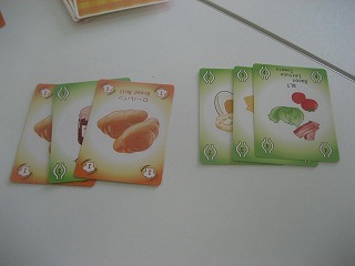 しのうじょうさんの2017春作品。パンと具材で3枚役2組を作る麻雀風ゲーム。今回は引きが偏り、1巡する前に決着するラウンドばかり。