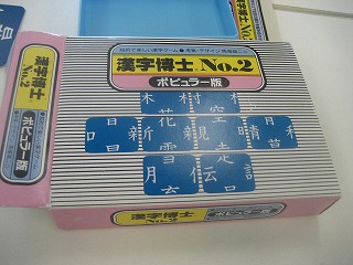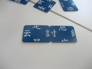 奥野かるた店さんの漢字あわせ。めくったカードで漢字が成立したら獲得、2×2に配置できたら勝ちというハウスルールで。それでも引きが悪いと結構長引きます。