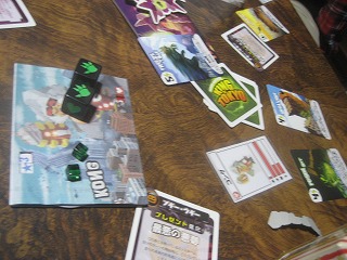 IELLO社の、怪獣がトーキョーの支配を目指すゲーム。5人戦なのでトーキョー湾も使用。街喰らいと毒吐きを習得したコングが、5ダメージのレッドスターミサイルから流れをつかんで勝利。