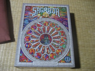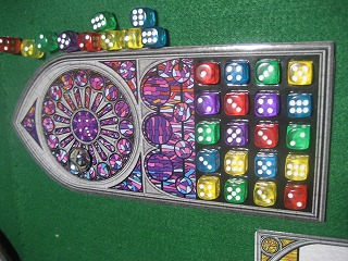 FloodgateGames、話題の輸入ゲーム。半透明ダイスを配置し聖堂のステンドグラスを作る。出目運が基本ながら、ダイス獲得と道具カードでいろいろ作戦も立てられる、リプレイ性も高い良作。