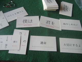 CRIMAGEさんの、2017秋の新作。配られたフレーズでプロポーズを作成。上手くプロポーズになるのは珍しく、狂気の脅迫文が出来上がることが多いような。