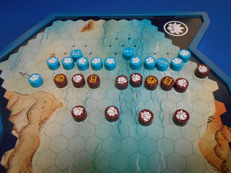 先週ボドゲやってきたので、その感想です。 まずはギャラクシートラッカー。 チュートリアルを飛ばし、レベル2からスタート! 上の写真は自分が組み上げた宇宙船。 むき出しのコネクタがやや多いがそこそこバランスが取れてる。 終了時、左舷後方に隕石が当たりバリアとエンジンが破損してしまった。 赤品物を多く回収できたが品物以外の点が伸びず。 なかなか難儀な航海だった! 第二戦はレベル3。 かなり緻密に設計された宇宙船が完成する。 航行中さまざまな困難があり、船員の半数が犠牲に。 物資積載量や戦闘力・航行力が高かっため得点はかなり伸びた! 航海がランダムなため、トラブル少なくあっさり終わってしまう時があるものの、 最初の宇宙船作りで充分な楽しさを確保してるため、この点だけでも 唯一無二のゲームだと思います。 3箱もってるぜ!!! EWE11 決戦壇ノ浦。 まさに、鎌倉殿の13人がこの場面だった旬な時期にプレイ。 ラウンドごとに潮の流れが違い、移動に変動をもたらすのが特徴。 第1ラウンド 平家艦隊 攻めの姿勢で前進。やられたら即敗北の安徳天皇だけは後退させる。 第2ラウンド 間接攻撃で抗戦を試みる源氏艦隊。 平家艦隊は玉砕覚悟で更に前進。 おもいきった攻勢に源氏艦隊の損害率やや高い。 第3ラウンド 互いにおびただしい損害を受ける。盤面が寂しくなってくる。 第4ラウンド もはや無傷の船がない平家艦隊、源氏艦隊を封じ込めるため最小のZOC線を張り抵抗。 第5ラウンド 奇蹟的に生き残った平家艦隊が最後まで粘り、 安徳天皇を守り切った。 平家の勝利。 戦闘が必ず1vs1なので、運不運で結構強めながら、 潮の流れは上手くゲームに作用している感じがしました。 なかなか乙なゲームでした。 今回の問題作 リヒトホーフェン。 対戦型ゲームブックという体で、2冊の本と記入シートを使って ゲームを進める。 全ては戦闘機の行動選択によって進行し、 本の内容はその位置関係が表示されている。 相手に弾を当て一定のダメージが蓄積されると終了。 プレイ感は選択肢が多いテキストアドベンチャーをやる感じだが、 絵と行動選択の先に謎の整合性があるため、 何か巧妙な手品を見せられた気分になるゲームだ。 これは凄過ぎる・・・ ![]() 余りに衝撃が大きかったため、 後日、自分で最小モデルを作って検証してみた。 たぶん、そんなに大きくない盤面が設定されてて、 自機の向きと座標を交換しあって最後に自機が向く方向で 互いの交点を割り出してるんだと思うんだよな。 でも、フルルールだと高度とかもあるんだよな。 これ作った奴ヤバ過ぎだろう、天才か!! 行動の選択はおそらく戦闘機乗りの教本とか参考で そのシチュエーションごとの有利不利の選択を設定してるんだろうな。 結構シャレにならないゲームだよこれ。 80年代にこれ考えつくのやば過ぎる。 世の中にはまだ見ぬ傑作が多いことを思い知りました。 とにかくすげーです 続いて飛行機特集 ウイングオブウォー。 1戦目、後方にも撃てる機体で無双。 2戦目、たまたま当たった弾が当たりどころが良く即撃破。 このゲームは凄い低確率でクリティカルがある。 3戦目 調子に乗った機体運動でまさかのコースアウト敗北。 目分量で油断するとあっさり明後日の方向に飛んでく!! メジャーをカード3枚プロットで表現するミニチュアゲームって感じで なかなか面白い。 飛行機ごとの性能も大雑把にしか動けないのとか 変態機動をかますのとか細かい動きが取れるのとか個性が良く出てる。 これはいろいろ試して飛ばしたくなる良ゲーでした。 今回やったのは複翼機ですが二次大戦版もあるそうです! 最後は KODACHI-小太刀ー 一応源平の時代に暗躍してた忍者がテーマの対戦型デッキ構築ゲーム。 なんじゃそりゃ!!というテーマのわりに、 ゲームシステムはかなり面白い。 基本はお買い物デッキビルドで、欲しいものが買えたり買えなかったりな ドミニオン的あれやそれなのだが、なんと坊主めくりの要素が加わり、 毎手番ざわつくギャンブルが展開される。 これがまた 結構面白い。いくつかコンボもありそうだった。 得点源も多いし、こりゃ意外な傑作。 そんな感じでしたー