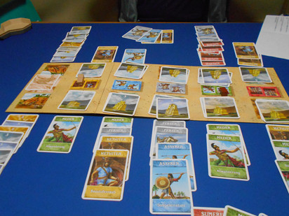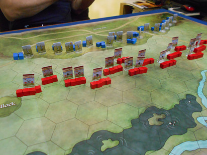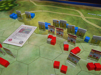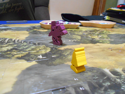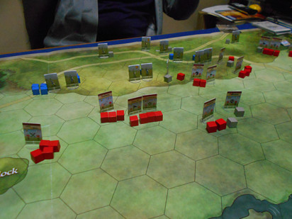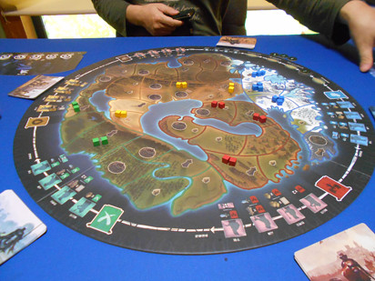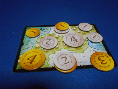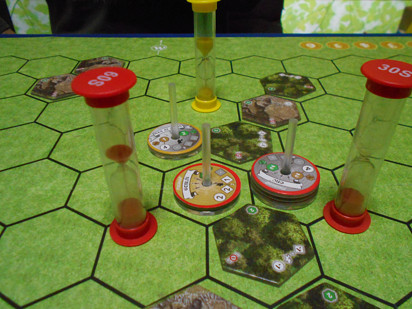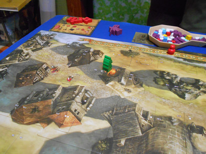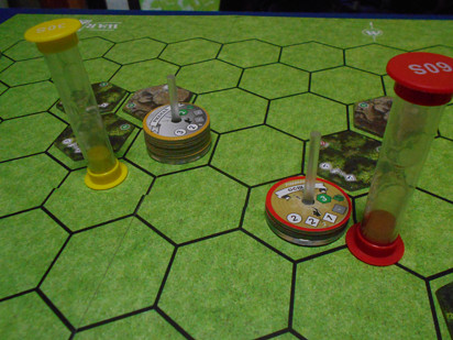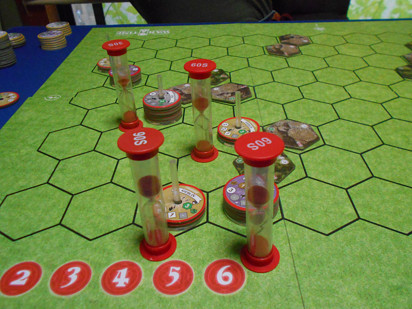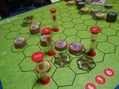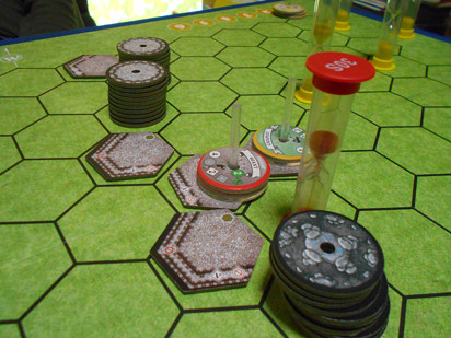花粉でえらい目に遭ってますが、 今月も新たなボードゲームをたくさんプレイしました! ■ウォータイム 砂時計を使用するリアルタイムウォーゲーム。 ユニットのアクションが終えた時に砂時計が置かれ、 砂が落ち切るまでそのユニットは次のアクションを実行できない。 いわゆるユニットごとのウエイトタイムに砂時計が使われる。 砂時計は写真のように置かれる。 ユニットはディスク状のチップが積まれていて、 この詰まれた数が耐久力となる。 すべて取り除かれると壊滅。 各砂時計にも3分や6分など差異がある。 追撃をかける時は早い時計を使用したり、 様子を見には長めの時計を使用するなど、 戦況に合わせた砂時計の選択が重要になる。 写真は攻城戦。城壁の耐久力もチップを積んで表現される。 これは、想像以上に良かった。 マニュアルの時点では反射神経が必要な手先の速さで勝敗が 決まっちゃうような印象だったが、プレイしてみると、 そこまで忙しくはない。3~4手アクションを行うと 手持ちの砂時計が無くなるので、いずれかの砂が落ち切るまで 待つしかない。これが丁度良い塩梅で待つ間に もう2~3手を考えておくといった感じだ。 これがユニットの数だけ砂時計があったら大変で制御し切れないが、 砂時計自体の本数に限りがあり、一斉に動かせる数は少なく リアルタイム過ぎない。 非常に良く整えられたデザインだ。 それでいて挑戦的。 こういった半リアルタイム処理はまだまだ進化するのかもしれない。 ■コインエイジ コインを投げてその裏表の数でアクションの種類が決まり、 最終的に地域ごとのマジョリティで決するゲーム。 サクっと遊べるので、全マッププレイした。 アクション決めでの運は多分にあるものの、 序盤を越えたぐらいから一手一手の選択は 相手を潰すか地固めするかのジレンマが深く、 短時間で濃厚かつコンパクトな良作でした。 ■ウォーオブウィスパー 相争う5つの国を陰から操る秘密結社になるゲーム。 各国の重要ポストに自らの息がかかった使者を送りアクションを取る。 アクションにより盤面の兵力が動き、村や都市を奪い 各国の利益や損害となる。ゲーム開始時に密かに決めておいた どの国に肩入れするかの方針で勝利点決算が行われる。 正体隠匿要素が強いので、大人数の方が向いてるゲームなのでは? と思いきや、2人でも面白かった。 逆に3~4人だと方針が似てる同士に組まれると逆転が 難しいかもしれない。2人が適正人数説あるかもしれない。 ゲ―ム自体は円形のボードと、それを1周すると1ラウンドになる デザインがが美しい。 ■ロビンフッドの冒険 第3話。 前回開拓した秘密基地から出動し、今度は城の忍び込むミッションだ。 どうやって忍び込み、どうやって脱出し、どうやって城のお宝を開けるか、 再び城周辺での情報収集がはじまる!! 今回も結構ギリギリでクリア。 これはホントに重要な攻略法だけど、 一度会った人物の職業は絶対に覚えておいた方が良い。 木こりと鍛冶屋が別だから!! 商人は馬車ぽいのじゃなくてリヤカーっぽい奴だから!! 今回は謎のお宝を開けてエピソードが終わった。 果たしてその中身は!? 次回に続く ■ダークエイジ 今回はヘイスティングスの戦いのシナリオ。 ノルマンディー公ウィリアムとホランド王との一大決戦だ。 ホランド王の軍は丘に布陣し地の利を得ているが、 ウィリアム王の軍は弓兵や騎兵を備えている。 丘と平野の境が最前線となり、果てしない削り合いにもつれ込んでいく。 シナリオルール上、3枚のイベントカードが公開されたら ホランド王側の勝利だったが、イベントカードが山札の底にあったため 激しい戦いが続き、被害数判定にまで持ち込まれウィリアム王が勝利した。 いやー イベントカードが山札半ばにあったら勝敗は逆だった。 相変わらず戦闘のダイスロールは楽しく出来てるし、 耐久力を表わすキューブも負傷状態の灰色キューブが良く機能してる。 なにかトークン置いて消耗を表現するのは誰でも1度は思いつくけど、 この灰色はなかなか思いつかないと思う。そのうち参考にしたい。 ■バベル ウヴェローゼンベルクのコスモス中箱。 自コマを操り、塔を建てたり、各人種を呼び寄せたり、 その人種の能力で相手を困らすゲーム。 塔が勝利点となっており、15点を先取し相手が10点以下なら即勝利。 でなければ、天井20点まで競う。 各人種の能力がハデで、相手の塔を壊したり奪ったりできる。 これにより超不毛な争いが展開し、15点に届きそうで届かない、 1手許すと、5点ぐらいは破壊されたり奪われたりで、 結構激しいゲームだった。 ウヴェはワーカープレイスのイメージが強いデザイナーで、 このゲームも駒とアクション位置の連動はちょっとワーカープレイスの アクション決定に近いものを彷彿とさせる。 ルール量は少なく分かり易いゲームだが、手番中できることが多く、 各人種の能力も豊富で思わぬコンボが組み上がる事が多々ある。 なかなか